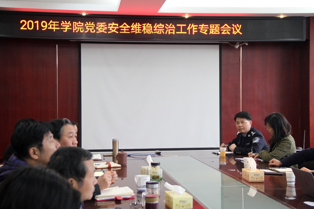 2019年3月13日上午,我院在行政办公楼517会议室召开了2019年院党委安全维稳综治工作专题会议,院党委书记周忠新、院长李定珍和所有党委委员参加会议。会上,保卫处处长周旭汇报了学校2019年新学期开学以来的安全稳定与综治工作情况。