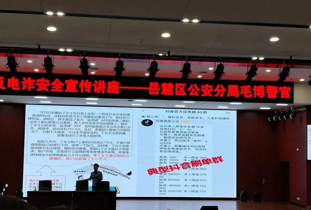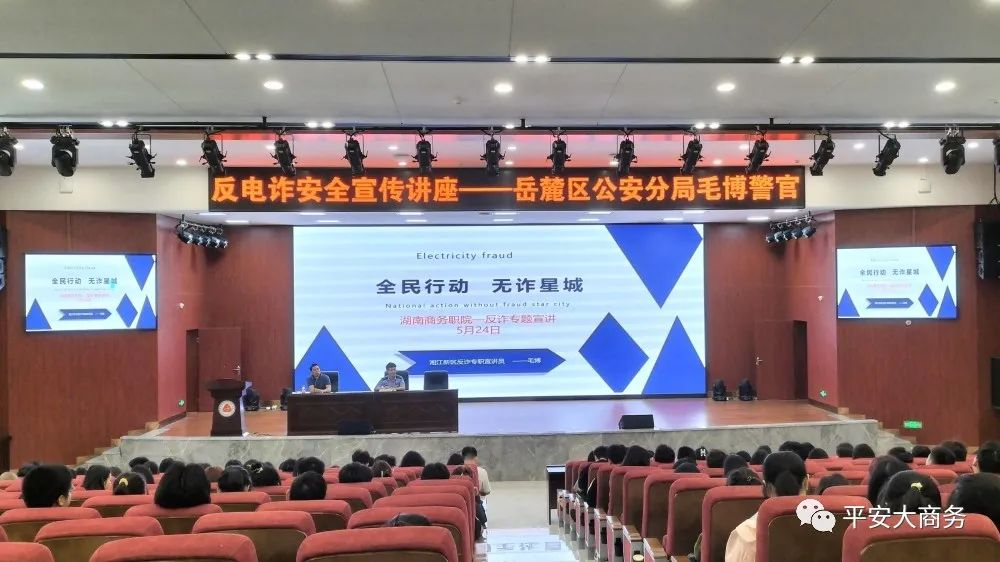 为进一步强化我校反诈宣传教育、普及反诈知识,提高学生反诈防骗能力增强防范意识,努力营造安全和谐的校园环境,2023年5月24日13:30于产教融合大楼一楼报告厅我校召开反电信诈骗安全主题讲座。本次讲座我们邀请到岳麓区公安分局毛博警官。