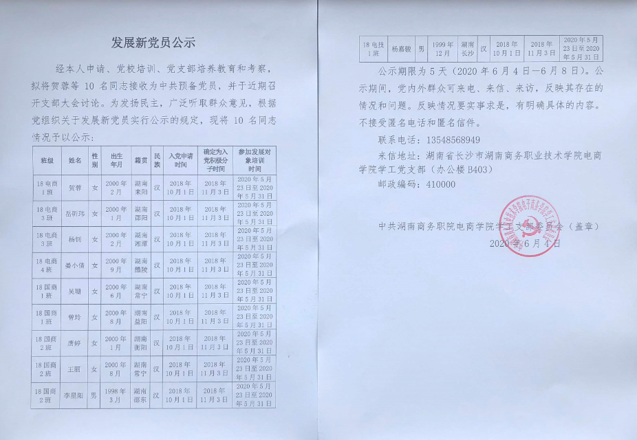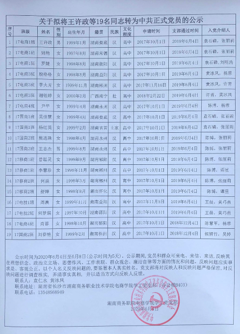 2020年上半年电商学院学工党支部发展新党员及预备党员转正公示