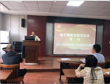 首先,电商学院党总支书记孙春明带领全体党员学习“习近平总书记赴湖南考察的讲话精神”,孙书记简略介绍了习近平总书记在湖南考察的主要行程及所释放的基本信息,重点学习了习近平总书记在考察过程中以及听取湖南省委和省政府工作汇报后的系列讲话精神。