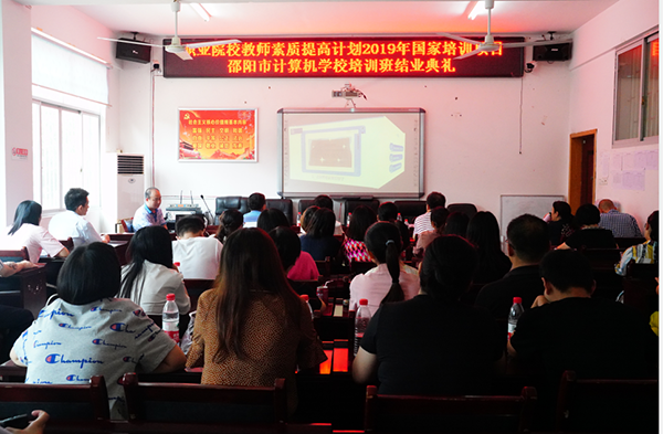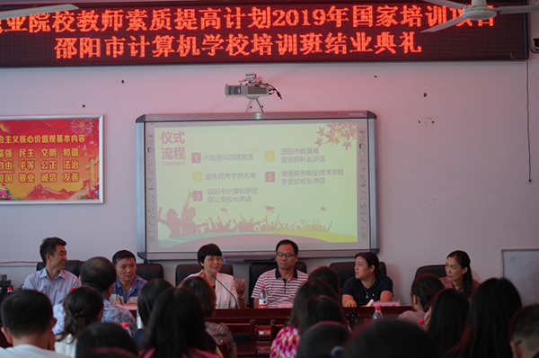本网讯 8月19日上午,职业院校教师教育教学素质提高计划2019年国家级培训项目——“送培到校精准培训”邵阳市计算机学校培训班举行结业典礼,活动期间掌声不断,争做一名幸福的职业教育工作者成为活动主题。邵阳市教育局副局长刘运礼、邵阳市教育局职成科科长曾丽莉、湖南商务职业技术学院院长李定珍、湖南商务职业技术学院电子商务学院院长曾鸣、电子商务学院副院长袁鑫、培训班主任周训菊、邵阳市计算机学校校长陈公良、副校长刘菲菲、教务科长欧阳至召及全体参训学员出席了结业典礼。