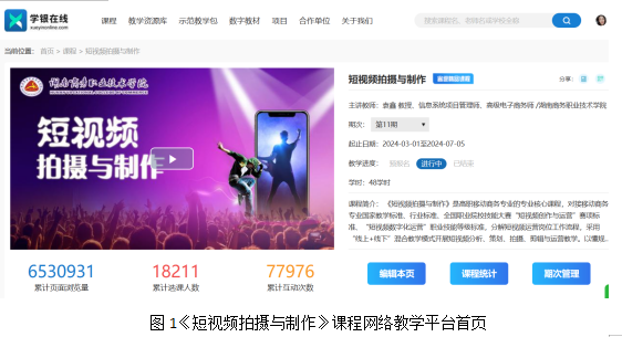 《短视频拍摄与制作》课程是高职移动商务、电子商务、农村电子商务专业的专业核心课程,对接专业国家教学标准、行业标准、全国职业院校技能大赛“短视频创作与运营”赛项标准、“短视频数字化运营”职业技能等级标准,分解短视频运营岗位工作流程,采用“线上+线下”混合教学模式开展短视频分析、策划、拍摄、剪辑与运营教学。教学团队编写了与课程完全配套的新形态立体化教材《短视频设计与制作》,于2023年获得湖南省优秀教材??纬?023年认定为湖南省精品在线开放课程。