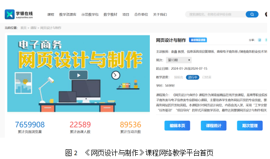 《网页设计与制作》课程主要培养学生商务网站开发的专业技能,掌握商务网站的开发和流程??纬陶攵酝成杓聘谖唬谌萦汕橙肷?,采用“工学交替”“任务驱动”“项目导向”的形式开展教学活动,最终达到掌握网页设计与制作相关知识和技能的目标。教学团队共获得国家级、省级教学竞赛奖励多次,立项了多项省级课题,编写了1本课程同名教材《网页设计与制作》,2021年获得湖南省优秀教材??纬逃?020年认定为湖南省精品在线开放课程。