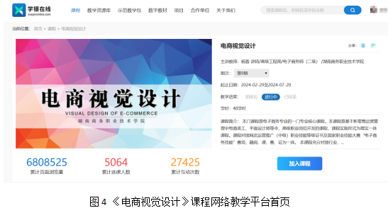 《电子商务视觉设计》课程是电子商务专业的核心课程,同时也是电商视觉设计岗位实践课程和赛证融通课程。该课程聚焦国家乡村振兴战略,根据电商视觉设计岗位国家、行业标准,依据国家与专业教学标准,紧扣专业人才培养方案、课程标准,以“德技并重 数商兴农”为主线,对接企业电商视觉设计岗位、电子商务技能竞赛要求、1+X网店运营推广职业技能考证,引入企业真实项目,构建以“岗课证赛”融合为导向的??榛纬探萄逑?实现“‘零距离’上岗、课程教学、职业认证、以赛促学”四者的完美结合,于2023年立项为湖南省精品在线开放课程。