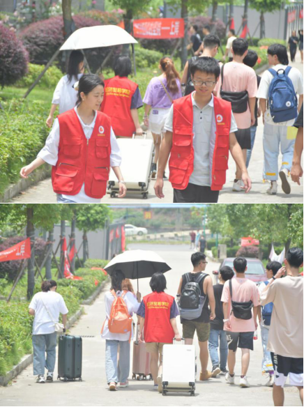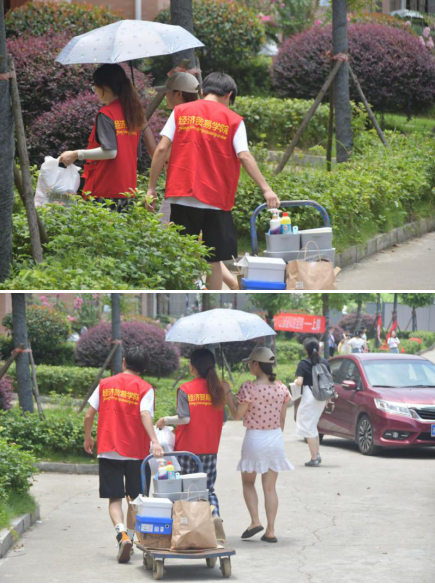 7月14日当天,考完试的志愿者们迅速穿好统一的服装,积极投入志愿服务工作当中?;疃殖。驹刚呙怯行蚍?,分工协作。有的在宿舍楼梯间帮同学抗重物,有的为出宿舍门的同学打遮阳伞,有的为路上的同学提拉行李,有的为出校门的同学送上祝福。一个个汗流浃背的小红马甲被庞大的行李遮盖,一次次迈着稳重的步伐上下楼,温暖了每个归家学子的心。