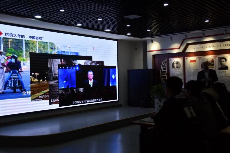 紧接着,易兰华副校长深入诠释了中国人民坚韧奉献、守望相助的民族精神、我国治理体系和治理能力的效能水平、改革开放以来积累的雄厚物质技术基础、人类命运共同体理念的大国担当四个方面。他一一分析了抗疫期间我国医保物资、生活物资、科技支撑三个层面的相关数据,引出了疫情防控的成效充分证明,中国共产党能够驾驭各种复杂局面,能够克服各种艰难险阻,是引领中华民族走向伟大复兴的坚强领导核心。