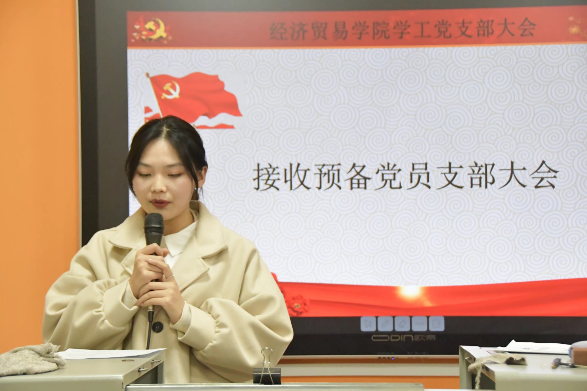 (通讯员 李坤)2020年12月1日下午2:00经济贸易学院学工党支部在经济贸易学院分党校二教101教室召开接收预备党员支部大会。大会主要讨论接收周含香等22名发展对象成为预备党员相关事宜。支部全体党员、发展对象以及发展对象入党介绍人等共60余人参加了会议。本次大会由经济贸易学院学工党支部书记方红梅同志主持。