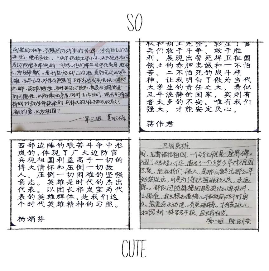 因为他们在,我们从未担心过边防??赐晔悠担巧钌畹厥艿搅斯奈韬图だ?。其中,蒋伟君同志说到:“戍边英雄的事迹深深地感染了我,一代又一代的守边战士们把青春献给了祖国最需到的地方,不忘初心,时刻守护祖国的每一寸热土,这种精神便是我们大学生学习的榜样。”向俊霖同志感言到:“我们应该记住每一位扎根于边防的战士们,他们正如一座座界碑,守护着我们祖国的安全。”沈芷瑶同志表态:“他们怀揣着‘我们的脚下,我站立的地方就是中国’的责任和自豪,用铁肩担当诠释着对党和人民的绝对忠诚。历史不会忘记边防战士,人民不会忘记边防战士,让我们向边防战士们致敬!” 我们今天的和平来之不易,每一位英雄烈士都值得铭记。线上会议结束后,各小组继续通过小组群进行讨论和交流。通过此次党日活动的学习,同志们纷纷表示要将爱国情怀和强国志向付诸于行,将自身专业学习融入社会发展中,为建设富强美好的祖国而奋斗。