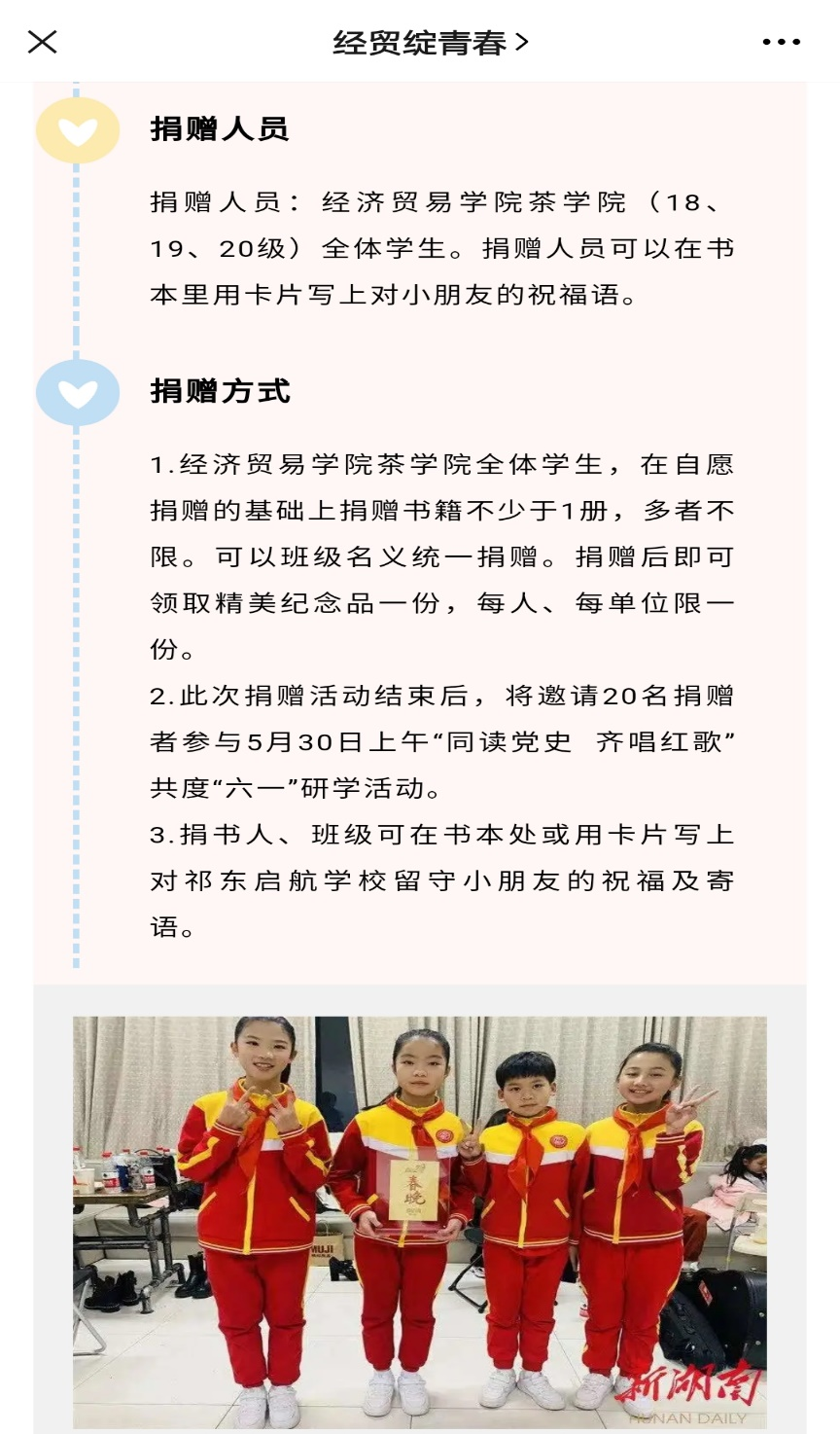 5月24日经贸绽青春发布“经济贸易学院学工党支部‘cue你’为祁东起航学校送‘爱心书’”活动,各团支部积极响应号召,捐赠书籍、撰写爱心留言卡。