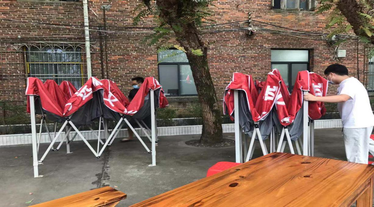 ▲谢春明同学搭建排队雨棚