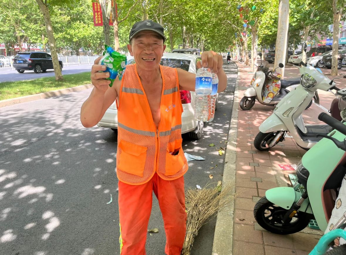 线下自主研习过程中,为户外工作者赠送矿泉水和降温物品,当收到这些物品时这位橙色的环卫工人洋溢着璀璨笑容,他开心的展示着手中的水和物资,笑容质朴而真诚的感染着现场每一个人。这一幕被23级茶艺与茶文化2班郭婷婷的镜头所记录下来,作为青年学子她正用着自己的方式展现青年担当,为关爱户外工作者贡献自己的一份力量。