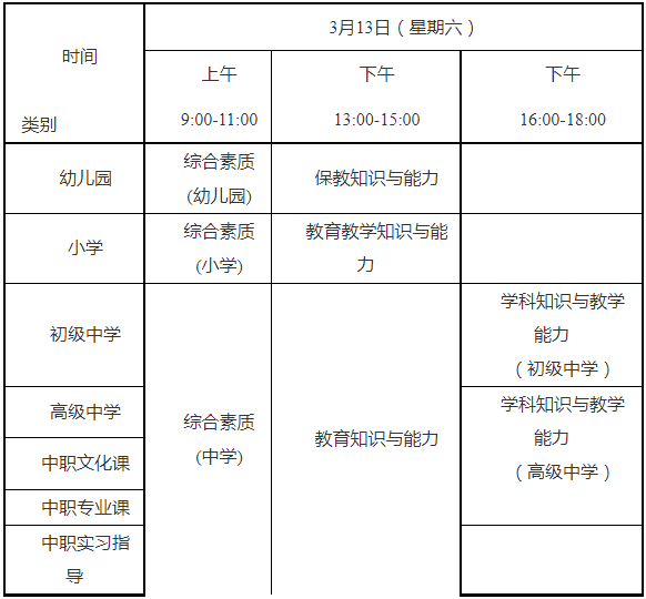 (四)全国统一考试时间为3月13日,各类别考试科目与时间安排如下: