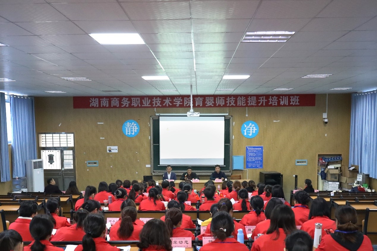 为了落实湖南省总工会“一户一产业工人”培养工程,发挥学校在“乡村振兴”和“精准扶贫”中的作用,提升育婴人员推拿及婴儿护理技能,提高从业人员收入,经过一个月的筹备,2019年10月26日育婴师技能提升培训班开班仪式在湖南商务职业技术学院隆重举行。湖南省直工会帮扶中心副主任李才良、专干李婷,学校副校长张朴、继续教育学院院长姜华斌、副院长陈斌、培训负责老师刘强,就业合作企业长沙湘嫂家政服务公司周春华经理出席了开班仪式,开班仪式由继续教育学院院长姜华斌主持。