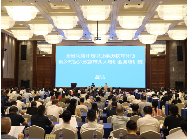 (通讯员 谷永林)2021年9月16日由湖南省乡村振兴局主办的雨露计划职业学历教育补助暨乡村振兴致富带头人业务培训班在长沙湖南宾馆开班。来自全省各市州、县市区乡村振兴局分管负责人、业务骨干等共计340余人参加培训。我院作为中标培训基地之一,学院院长李定珍、党委委员刘谦、继续教育学院院长陈斌、继续教育学院副院长石元珍参加了此次培训班。