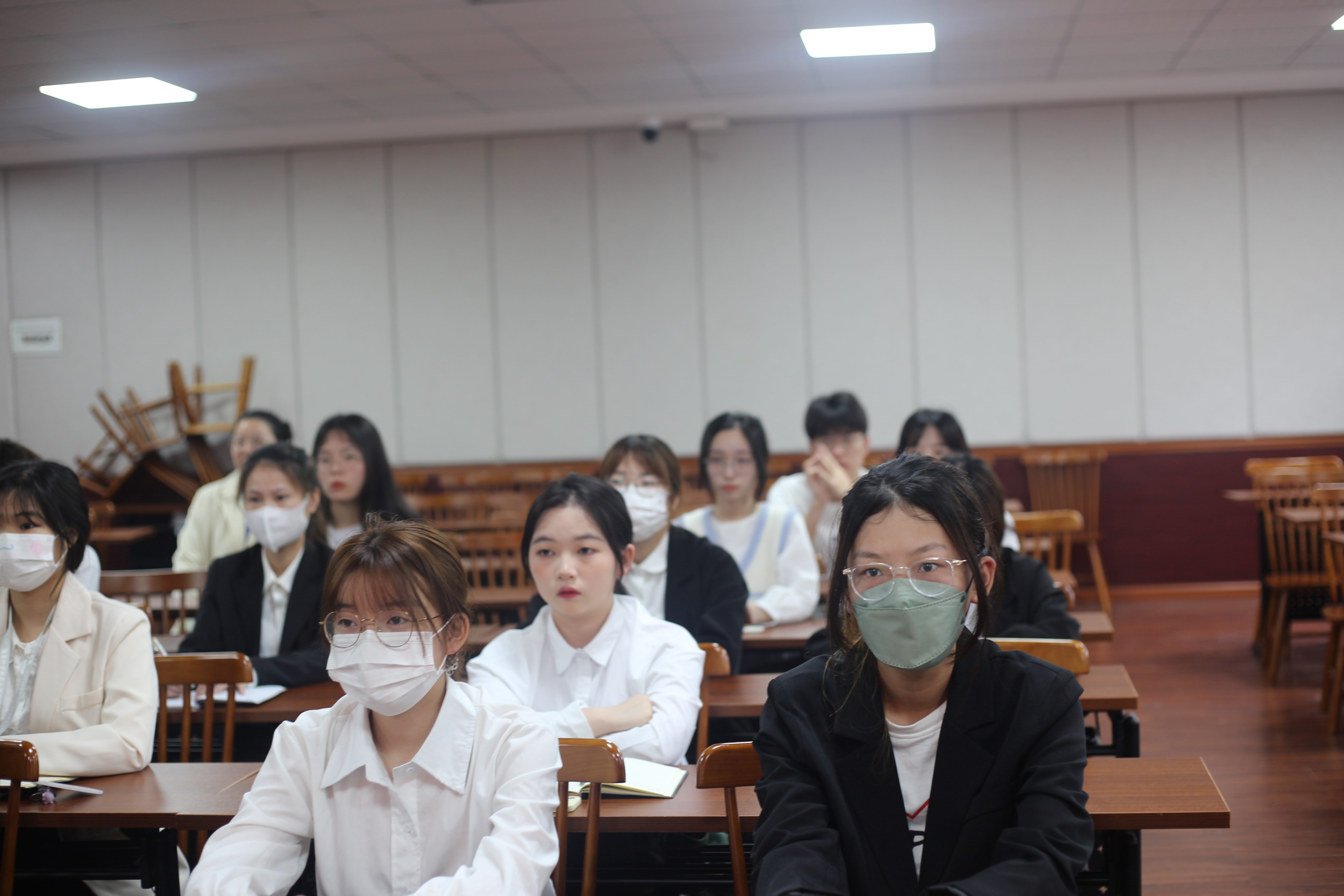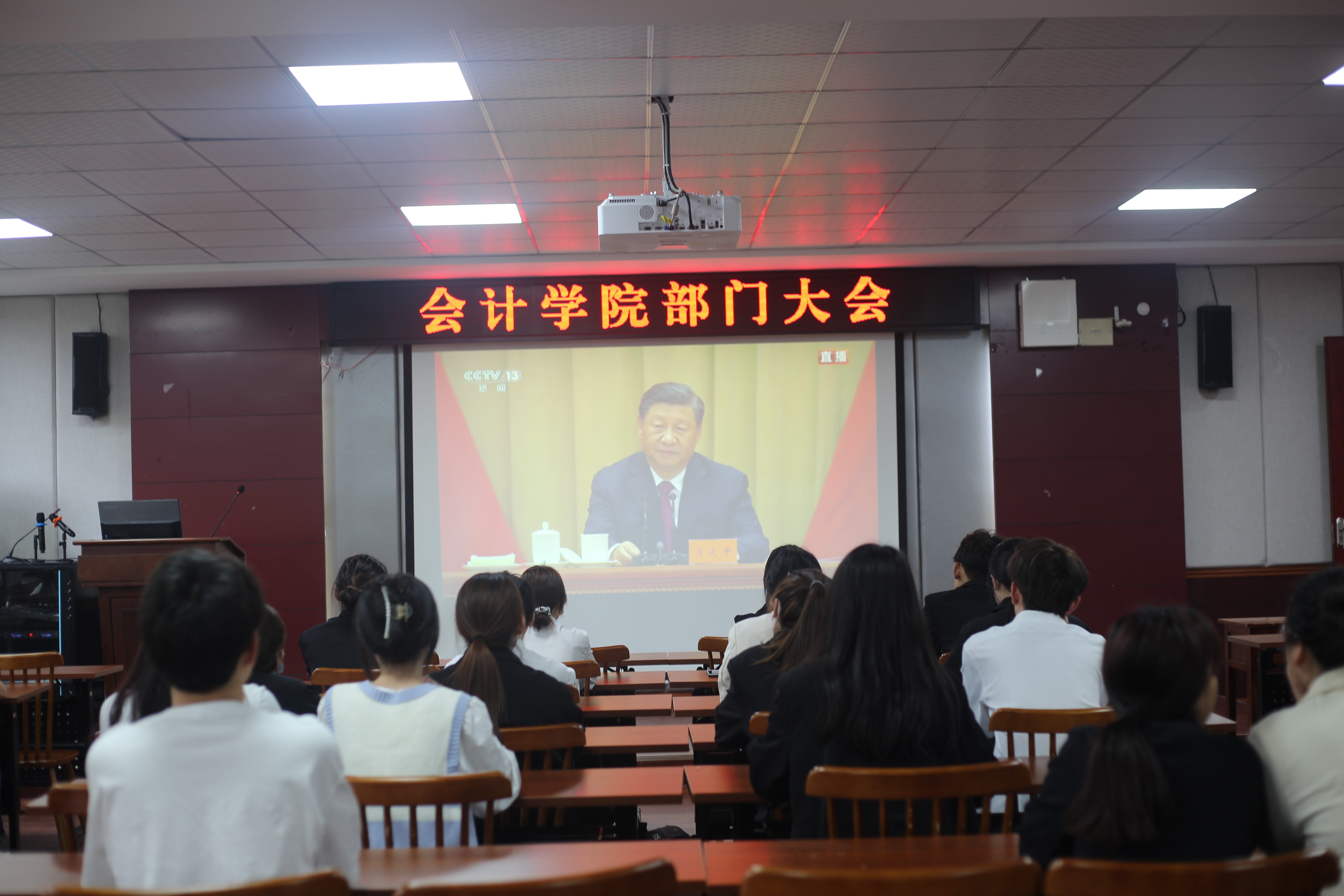 10:00,观看的学生干部们准时到达二教201,等待直播的开始。同学们都身着正装,到场后井然有序入座,自觉保持现场安静,彰显了会计学院学生干部的精神风貌和学习态度。