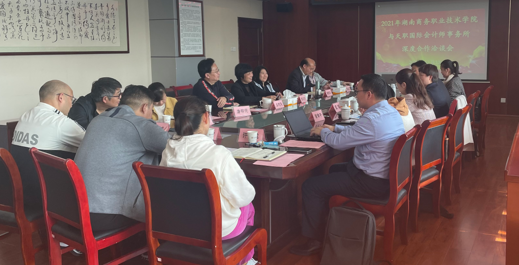 2021年11月13日上午,天职国际会计师事务所合伙人肖红英、业务拓展总监王珏、 高级经理魏瑞祺、曾幸子、李晶晶、 刘群飞到访我校商洽校企合作事宜,湖南商务职业技术学院院长李定珍、党委副书记廖志刚、副院长易兰华、副院长禹明华、创新创业学院院长吴庆松、合作交流处处长唐柳荷、会计学院院长柳志、会计学院党总支书记黄铖等代表出席仪式并座谈交流。