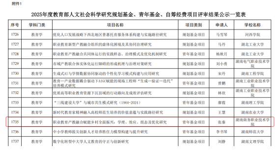 近日,2025年度教育部人文社科研究一般项目立项名单揭晓。湖南商务职业技术学院传来喜讯,该?;峒蒲г?5后副教授张秦主持的《职业教育产教融合赋能乡村全面振兴:学理、效应、组态及优化研究》成功获得青年基金项目立项。这一项目旨在探究职业教育服务国家乡村振兴战略的关键路径,具有重要的理论与现实意义。
