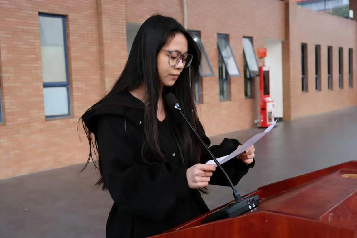 仪式上,优秀学生干部代表、2024级会计5班李言妍同学作了国旗下发言。她围绕“明确目标、踏实行动、灵活调整”三个关键词,结合自身的学习与学生工作经历,分享了她的体会与思考。她谈到,明确目标需要将长远愿景分解为可执行的阶段任务;踏实行动重在养成每日专注与坚持的习惯,并在团队协作中主动担当;灵活调整则是在面对变化时保持反思与优化能力,展现韧性。她以自身平衡学业与工作的实践为例,鼓励同学们在“规划—执行—调整”的循环中持续成长,用每一天的踏实奋斗夯实未来基础。