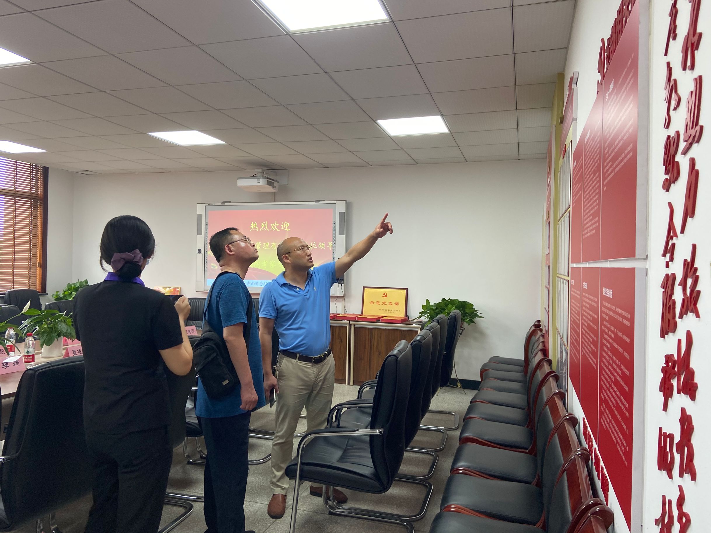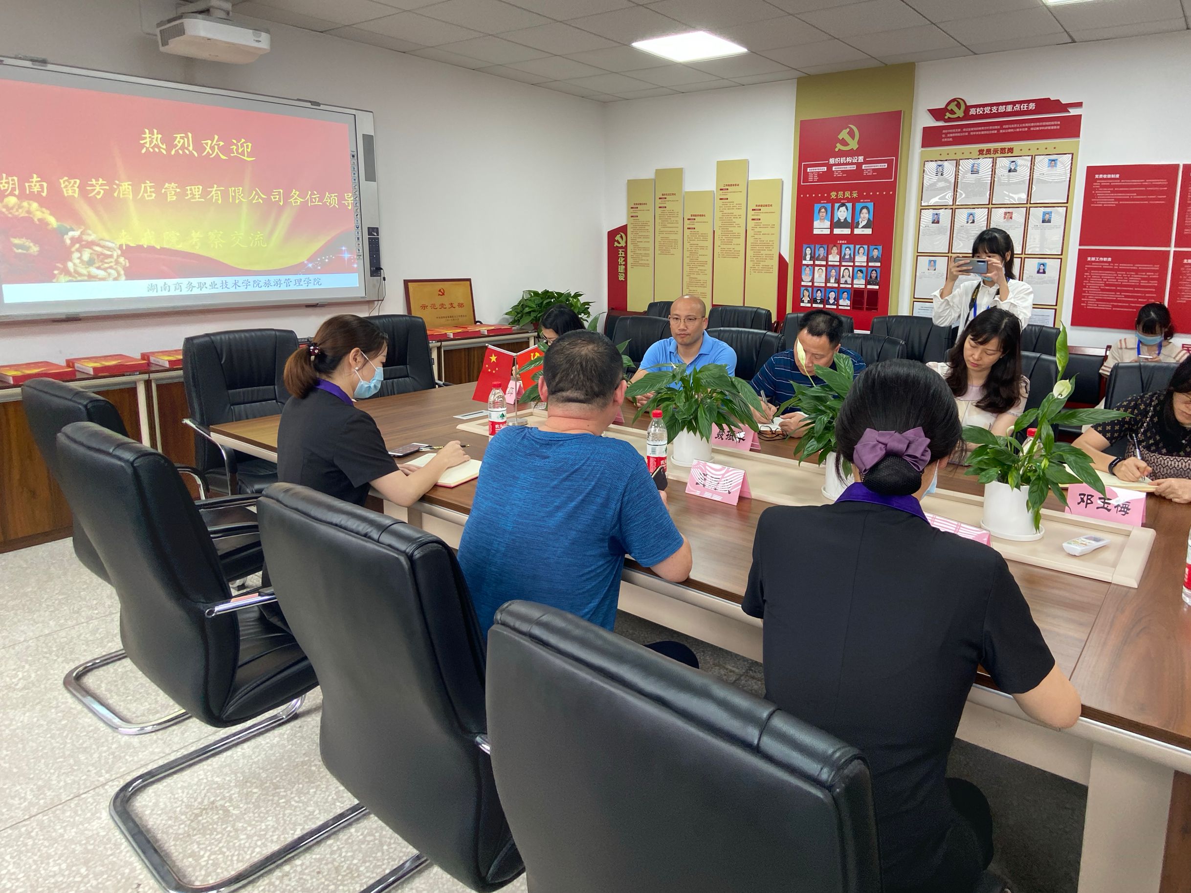 为进一步加强基层党支部的建设工作,以党建促发展,不断促进基层支部规范化、标准化建设,实现党建工作全面进步和提升,2020年6月5日下午,湖南留芳酒店管理有限公司党办主任王晓毅一行来到湖南商务职业技术学院旅游管理学院“湖南省直机关示范党支部”参观学习,深入交流党建工作经验做法,促党建工作共同提升。学院党委委员组织人事处处长聂振华,学院党政办副主任李琦,旅管学院党总支副书记黄铖等人陪同参观调研。