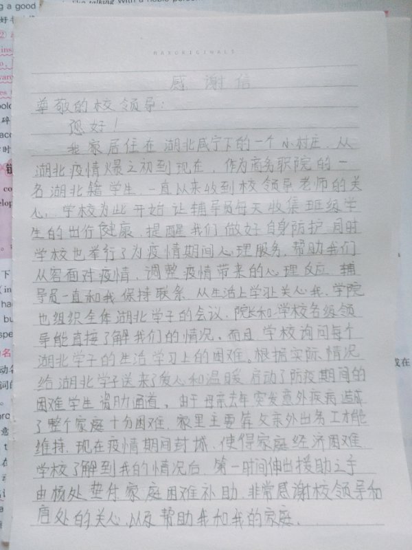 由于母亲去年突发意外疾病造成了整个家庭十分困难,家里主要靠父亲外出务工才能维持。现在疫情期间封城使得家庭经济困难。学校了解到我的情况后第一时间伸出援助之手,由杨处垫付家庭困难补助,非常感谢校领导和唐处的关心以及帮助我和我的家庭。