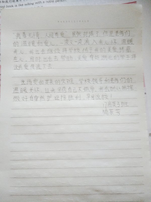 “病毒无情,人间有爱” 虽然封城了,但是老师们温暖的爱心,一波又一波涌入我心怀,温暖我心,我也会继续将学校给予我的关爱珍藏在心。同时也会去帮助、关爱身处湖北的学子,将这份爱传递下去。这场突如其来的灾难学校领导和老师们的温暖关怀,让我坚信自己不孤单,我会听从指挥做好自身防护,迎接胜利,早日返校。