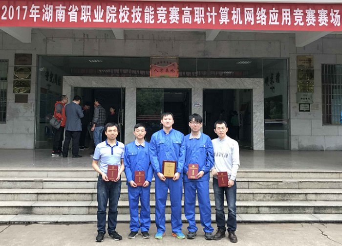 2017年4月26日-28日,2017年湖南省职业院校技能竞赛“高职计算机网络应用”项目在长沙民政职业技术学院举行。我省有25支队伍共计75名选手参赛。比赛内容:完成一定规模的智慧园区网络,包括符合数据中心需求的绿色、可靠、安全、智能的计算机网络拓扑规划,IP地址规划,设备配置与连接,云计算融合网络的搭建及配置,网络安全的规划和实施,无线网络设计、搭建与调试,网络综合布线规划,网络综合布线施工及管理,网络综合布线链路测试,网络性能检测等;同时考察学生的快速学习和应用能力,在竞赛中,学生需要根据现场提供的中文或简单英文技术文档完成新技术或新特性的简单配置和应用。我院选派计算机网络技术专业黄沐鑫、蒋演、丁嘉俊等3名选手,在苏命峰、谢林勇老师指导下,经过精心准备、刻苦训练、奋勇拼搏,成功卫冕,以第一名成绩荣获一等奖(团体)。
