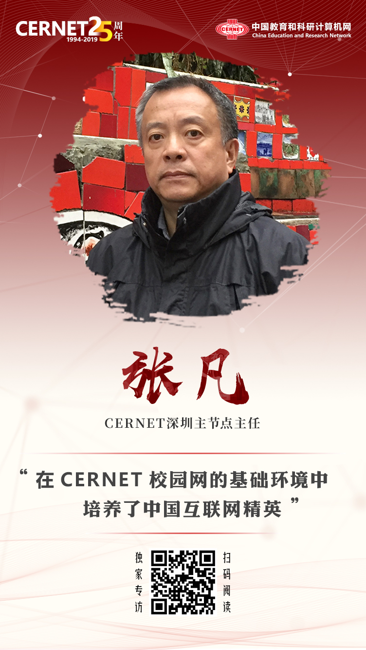 张凡,CERNET华南地区深圳主节点主任,深圳大学优课在线董事长。1987年毕业于南京大学,于1994年CERNET建设初期即开始承担CERNET华南地区深圳节点工作。在纪念CERNET建设二十周年大会上,张凡获“CERNET建设二十周年突出贡献先进个人”,其带领的CERNET深圳节点获“CERNET建设二十周年突出贡献先进集体奖”。