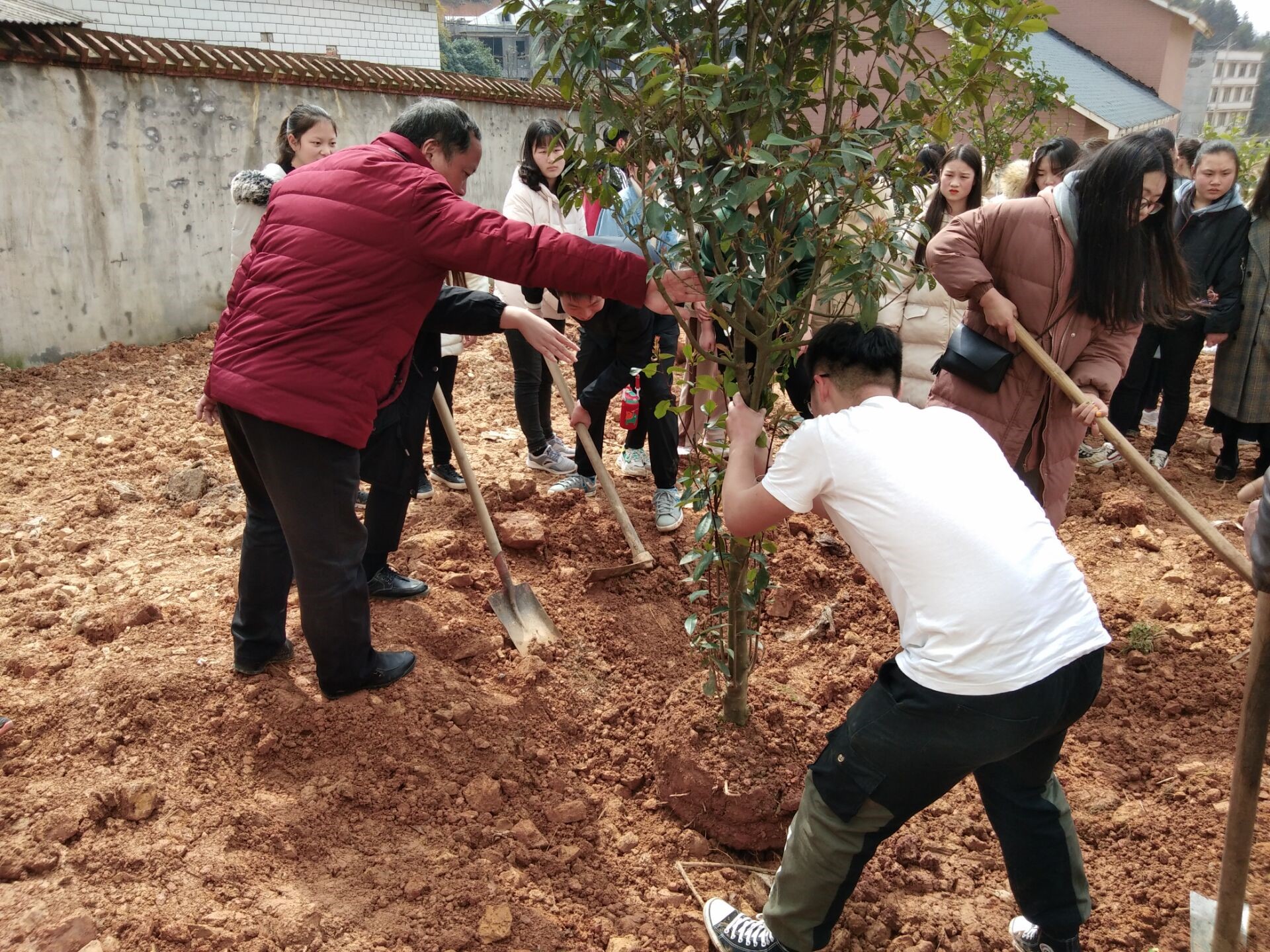 3月4日13:00,18电商3班全员到学??盏刂彩鳎油诳?、浇水到培土,植树过程可谓艰辛,无数次挥起锄头、铁锹,终将这棵树种下。十年树木,百年树人,一朝种下,扎根泥土。