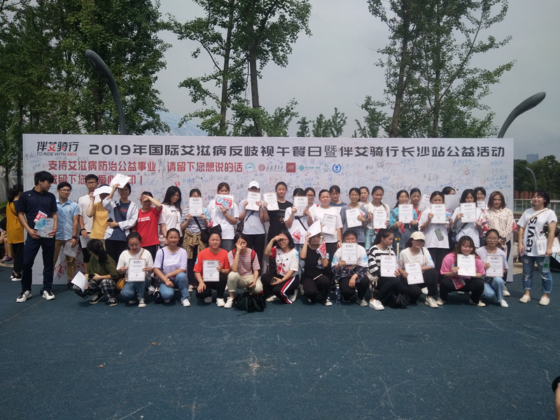 本网讯(通讯员:社联宣传部 柳妍颀)5月26日13:00,校团委安排我校青年志愿者协会组织志愿者参加了由湖南省卫生计生委健康教育宣传中心、长沙市第一医院、长沙市疾控中心、岳麓区疾控中心和长沙市青彩防艾志愿者服务中心等单位共同举办的2019年“伴艾骑行”长沙站公益活动,积极参与防艾宣传工作。