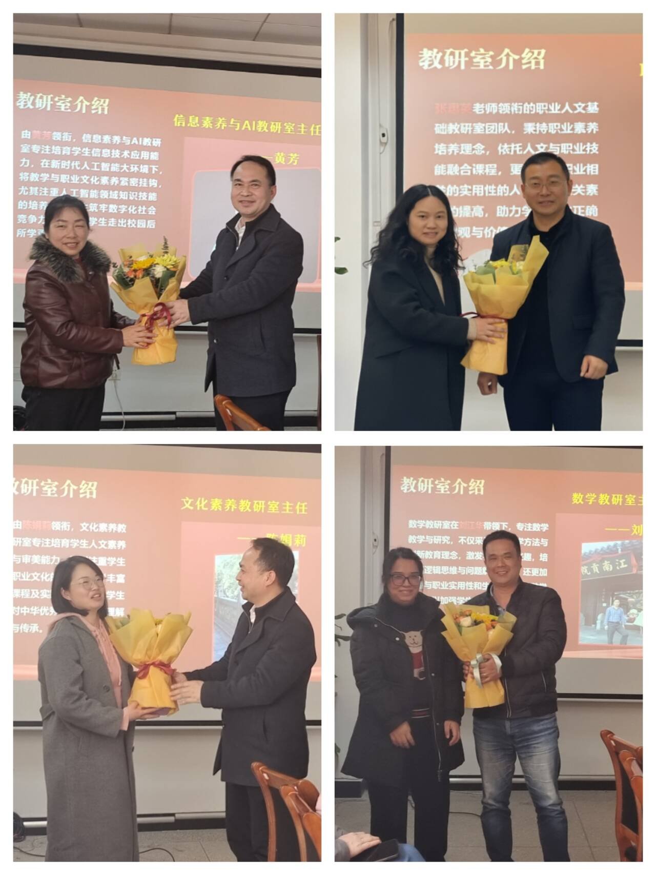 在两校融合背景下,基础课部新成立信息素养与AI丶职业人文基础丶文化素养丶数学等4个教研室,并正式任命黄芳丶张惠英、陈娟莉、刘江华等4位老师为教研室主任。此次调整不仅是部门发展的重要节点,更是两校师资深度融合的新起点。本次4位教研室主任中,既有连任多届的资深教研室主任,也有锐意进取、富有创新竞赛的中坚力量,他们后续将带领各教研室在课程建设、教学改革、课程思政方面持续发力、力争突破,为部门发展注入新动能。