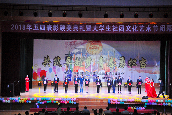 2018年 5月 8日晚7时 , 由学院团委主办,第十四届院团学会、学生社团联合会承办的2018年五四表彰颁奖典礼暨大学生社团文化艺术节闭幕式在学校体育馆成功举办。学院党委周忠新书记、学院廖良林副院长,党委组织部、保卫处、学院团委的负责人,各二级学院的党总支书记、团总支书记和辅导员,以及现场的1000多名师生一同到场观看。