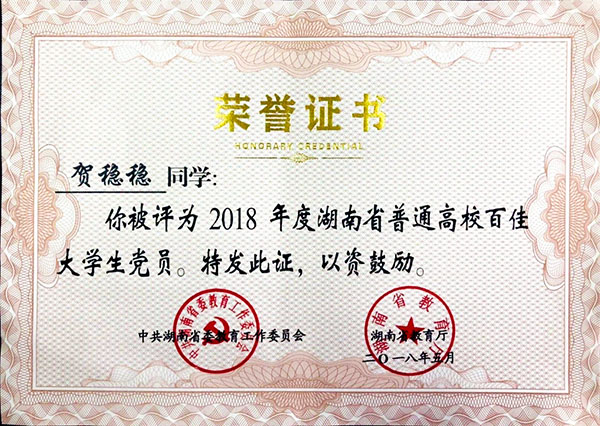 近日,从中共湖南省委教育工委《关于评选表彰2018年度湖南省普通高校百佳大学生党员的通知》(湘教工委通〔2018〕7号)中获悉,经学校评选推荐,省委教育工委、省教育厅审定,我校经济贸易学院物流管理专业贺稳稳同学获评“湖南省普通高校百佳大学生党员”称号。