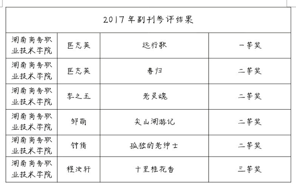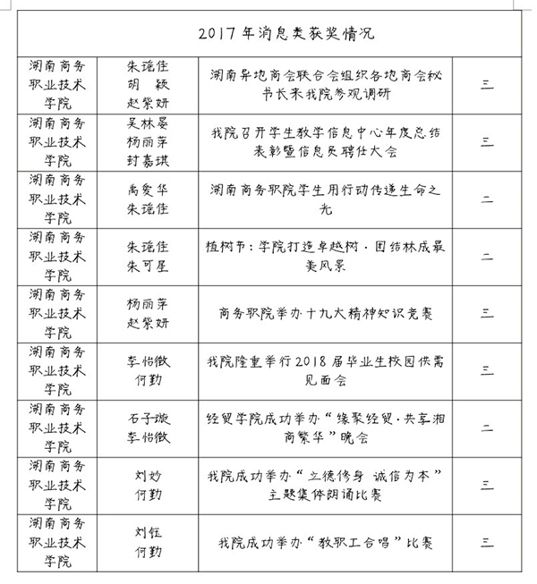近日,由中国高校校报协会湖南省分会、湖南省新闻工作者协会高校报分会、湖南省高校校报协会联合主办的2017年度“湖南高校新闻奖”评选结果揭晓,我院18件作品荣获奖项。其中,一等奖2个,二等奖7个,三等奖9个。