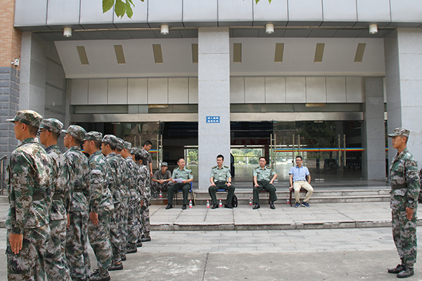 8月4日,湖南省军区学生军训办公室汤光强副主任、丁行行参谋,综合训练大队何平队长一行受邀来我院对学生军训教官队伍进行检查考核。我院廖良林副院长,学工部、武装部有关领导与老师陪同考核。