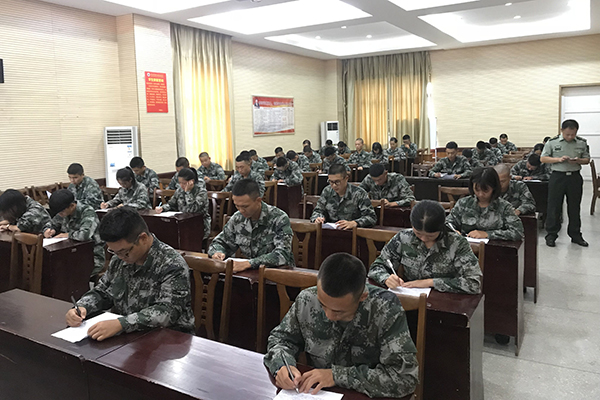 在省军区学生军训办领导的组织下,40多名学生教官在第五会议室参加了军事理论考试。理论考试结束后,省军区学生军训办领导来到训练场地,对学生教官队列基础与“四会”教学法进行了抽考,被抽考的学员以流畅的讲解、娴熟标准的动作示范、准确到位的指挥,展示了他们参与集训3个多月来取得的成果。随后,我院廖良林副院长和武装部唐柳荷部长分别向省军区学生军训办领导汇报了学生教官选拔培训和2018级新生军训工作准备的情况。抽考工作结束和听完汇报后,何平队长就本次考核工作进行了总结,他充分肯定了我院学生教官自训工作取得的成绩,高度评价了学生教官展示的军事技能,并勉励同学们继续加强训练,严格要求自己,精益求精,不断提高军事理论与军事技能,争做合格的军训教官。何队长还就学生教官如何开展新生军训带训工作提出了很多中肯的建设性指导意见。廖良林副院长对省军区学生军训办领导冒着酷暑来学院指导学生教官集训工作表达了诚挚的谢意。