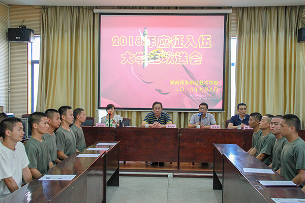 9月8日下午,我院在办公楼第五会议室隆重举行2018年应征入伍大学生欢送会。学院党委书记周忠新、副院长廖良林、相关部门负责人、武装部征兵专干、新兵代表、退役复学学生代表、在校生代表参加了欢送会?;嵋橛闪瘟剂指痹撼ぶ鞒?。
