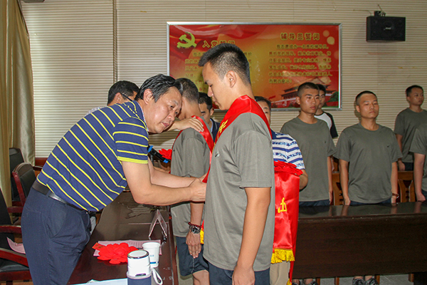 随后,学院党委周忠新书记和二级学院总支书记为应征入伍学生佩戴了“光荣入伍”的绶带和大红花。
