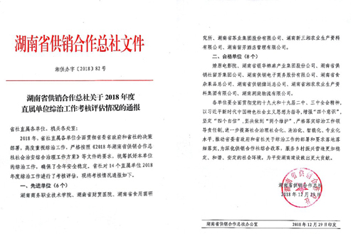 本网讯 日前,从湖南省供销合作总社传来喜讯,我校被评为湖南省供销合作总社直属单位“2018年度综治工作考核评估先进单位”。