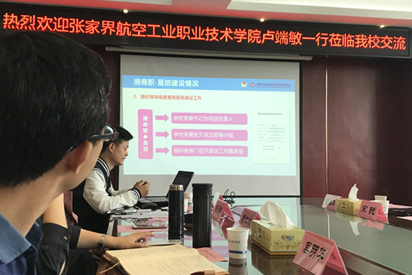 本网讯 (通讯员 陈慧军)2019年4月23日上午,张家界航空工业职业技术学院卢端敏副院长一行来我??挂装嘟ㄉ杩疾旖涣骰疃?,学校副校长廖良林、禹明华及学生工作部部长、二级学院党总支书记、校易班工作站技术人员、信息中心技术人员等在办公楼523会议室接待考察。