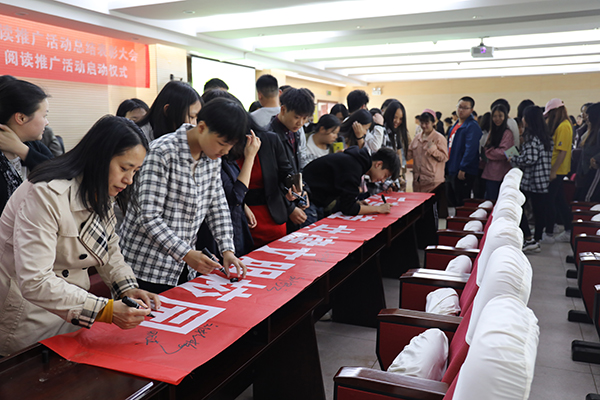 紧接着,刘沈荣宣读第二届“书香商务,浸润心灵”阅读推广活动方案。他说,第二届活动在第一届活动的基础上,新增了更多内容,将开展“超星杯”有奖阅读活动、“借阅排行榜”评选活动等。他呼吁大家积极参与读书推广活动,投入更大的读书热情。17级营销2班刘福同学宣读活动倡议书,倡导读书明理、读书求知、读书成才的新风尚。