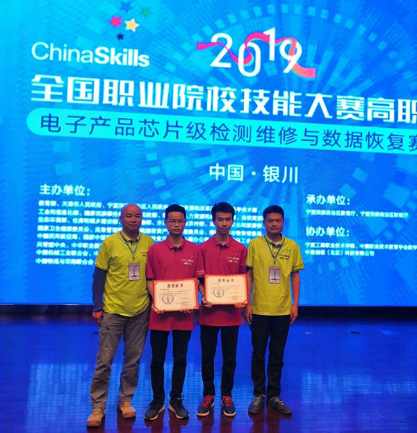 本网讯 (苏命峰) 5月10日-12日,2019年全国职业院校技能大赛电子产品芯片级检测维修与数据恢复赛项(高职组)在宁夏工商职业技术学院成功举办,来自全国30个省、自治区、直辖市的90支代表队共180名选手参赛。我校由刘丹、苏神保两位老师指导,来自18大数据1班李帅、17电信3班蔡文超组成的代表队不畏强手、奋勇拼搏、表现出色,荣获二等奖。