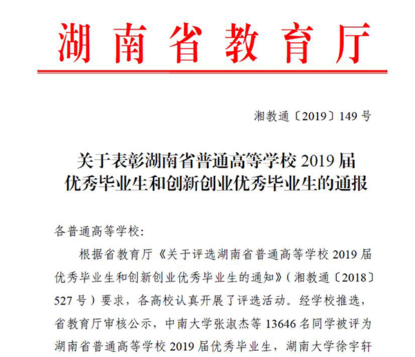 本网讯 (王振亚)日前,湖南省教育厅专门下发文件隆重表彰2019 届优秀毕业生和创新创业优秀毕业生,我校共有147名毕业生受表彰,其中优秀毕业生(含退伍的优秀毕业生16名)135名,创新创业优秀毕业生12名。