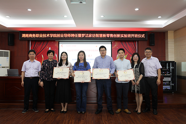 本网讯(记者 刘佳蕊)5月25日9时,创业导师聘任暨“梦洁家纺智慧零售班”开班仪式在B417会议室举行。梦洁家纺智慧零售总经理成艳,职闯网络科技创始人、梦洁家纺决策顾问黄治国,梦洁微营销总监罗雅琴,职闯网络营运总监刘鑫,我校校长李定珍,党委委员禹明华,继续教育学院院长姜华斌,创新创业学院副院长吴庆松等出席仪式。报名此次实验班的42名学生参加仪式。