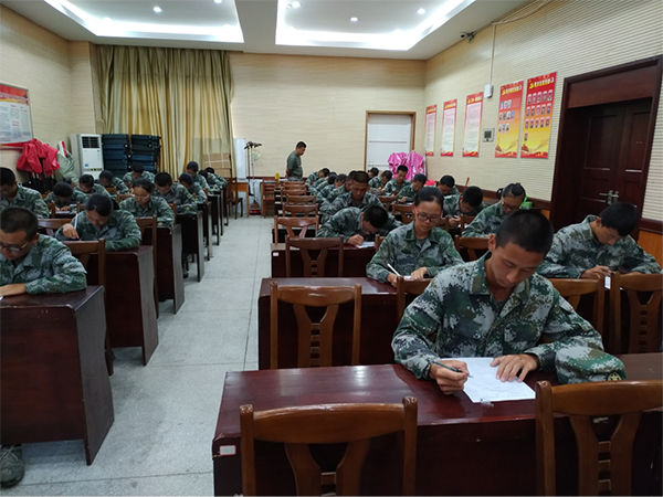 在省军区综合训练大队领导的组织下,在学校参加暑假集训的36名学生教官在办公楼一楼第五会议室参加了军事理论考试。参加考试的学生教官沉着冷静,细致守纪,认真答题。