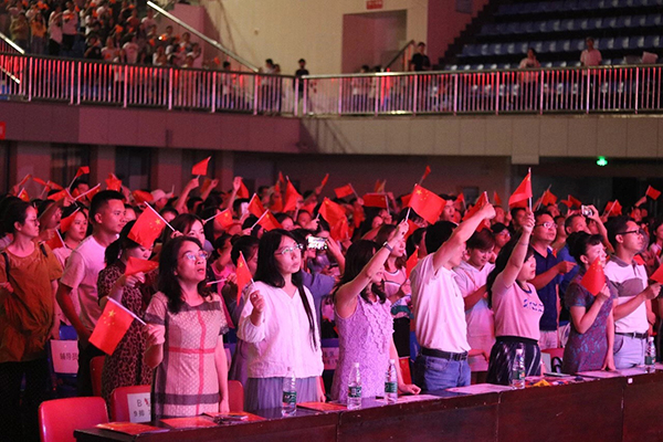 “我和我的祖国,一刻也不能分割,无论我走到哪里,都留下一首赞歌……”当压轴登场的《我和我的祖国》旋律响起,全体师生起立,挥舞着手中国旗齐声合唱,以歌声唱出对新中国的美好祝愿。