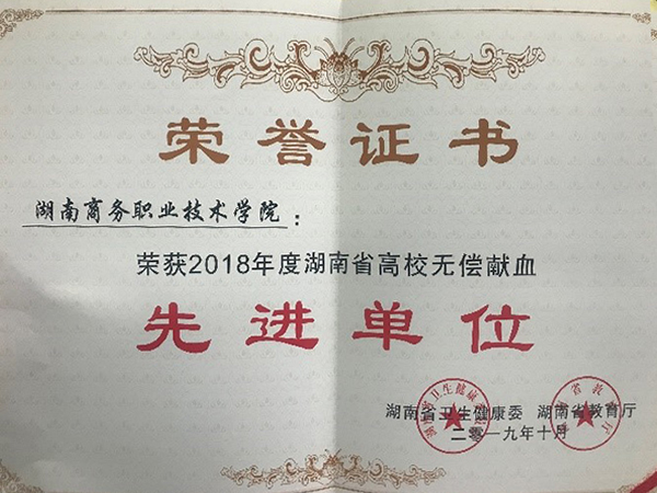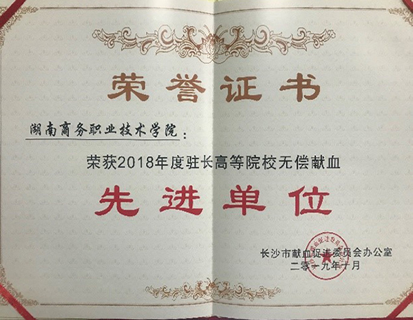 为表彰先进,促进我市献血活动持续开展,2019年10月21日,湖南省教育厅、湖南省卫健委联系长沙血液中心召开2019年度驻长高等院校无偿献血工作会议,会上宣读了相关表彰文件并进行了颁奖仪式,其中在湖南省卫生计生委和湖南省教育厅联合发布的《关于表彰2018年度全省高校无偿献血先进单位和优秀组织者的通报》(湘卫函〔2019〕328号)中,我校被授予“2018年度湖南省高校无偿献血先进单位”称号。在长沙市献血促进委员会办公室发布的《关于表彰2018年度驻长高等院校无偿献血先进学校和优秀组织者的通报》(长献办发〔2019〕1号)中,我校荣获“2018年度驻长高等院校无偿献血先进单位”。