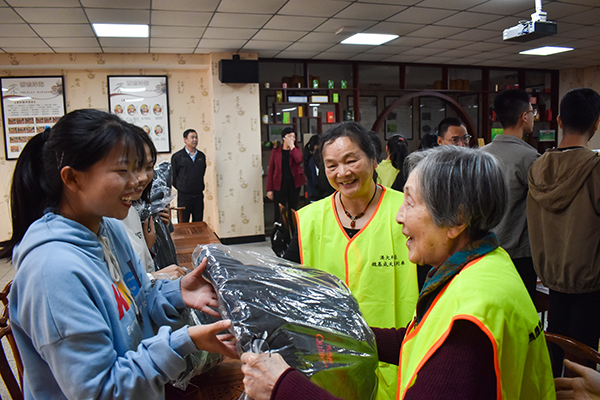 活动现场,同学们依次接过孟妈妈团队递过来的冬衣,脸上洋溢着幸福的笑容,连连点头向孟妈妈及其团队表示感谢。孟妈妈团队中有位年近八旬的奶奶一直紧紧握着学生的手,嘘寒问暖,满目慈祥与关怀。受赠学生还纷纷加了孟妈妈微信,并给孟妈妈留言“孟妈妈您的笑容太有感染力了”、“谢谢您送的衣服和爱心,这是世界上最宝贵的衣服,用爱心编织和传递的衣服”。
