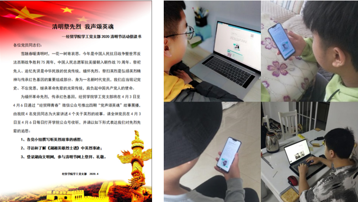 4月4日,该党支部全体党员在线开展“清明祭先烈,我声颂英魂”主题党日活动。本次活动主要以收听“党声颂英魂”故事展播的形式进行,为期4天?;疃?,党员同志们先后登录湖南文明网和中华英烈网,参与清明节网上祭拜、礼敬,在人民英雄纪念碑前为英烈献花,还通过经济贸易学院微信公众号“经贸释青春“,收听学生党员讲述的英雄故事《断肠明志的后卫师长:陈树湘》、《永不凋谢的兰花:伍若兰》、《烽火岁月家国情:左权》和《藏在衣柜里的父子情:毛岸英》等,表达对革命先烈的敬仰与缅怀。党员同志们在读后感中纷纷感言,要倍加珍惜先烈们用热血和生命换来的幸福生活,继承和发扬革命先烈艰苦奋斗、无私奉献的精神,不忘初心,砥砺前行,为实现中华民族伟大复兴而努力奋斗!