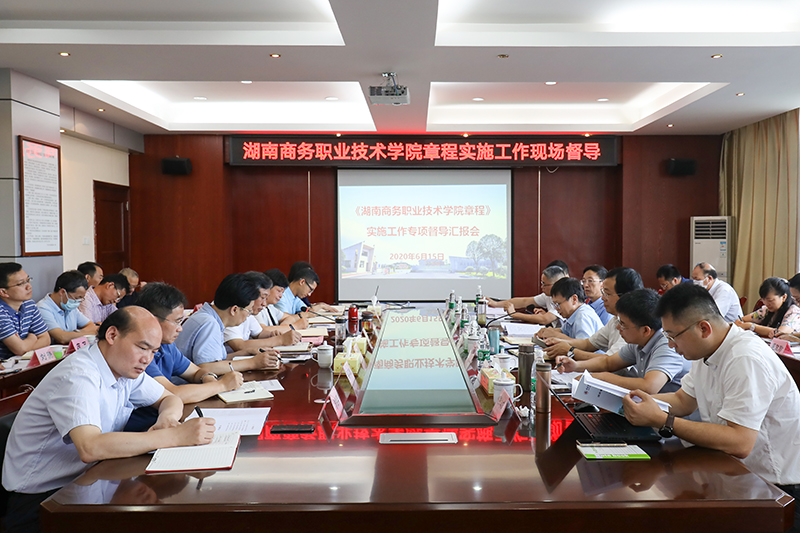 下午,督导组主持召开了章程实施工作意见反馈会,专家组成员分别就《章程》实施组织领导情况、党委领导下的院长负责制、校院两级管理体制、学术管理机制、民主管理机制、社会参与机制、师生权益?;?、法制工作机制、章程实施机制等方面反馈现场核查的意见,并提出整改意见。章兢代表督导组作总结讲话,从“三定位”、“三升目标”、“三融文化育人”等方面充分肯定了学校办学定位、办学特色、学生培养理念。他指出,学校坚持“服务湖南现代服务业转型升级,拓展农村商贸服务,培养高素质技术技能型湘商人才”的办学定位,提出了升中国特色高水平高职学校、升中国特色高水平专业群、升职业大学“三升”发展目标,打造了融传统文化、湘商文化、红色文化于一体的文化育人体系,目标层次清晰,行业特色明显,学校管理呈现出朝气蓬勃、团结向上的氛围。他强调,要以《章程》为统领,坚持目标和问题导向,立足校情,不断检验和完善制度建设,以督促建、以督促改,不断释放制度活力,加速完善中国特色现代大学制度,完善大学治理结构,切实提高治理效能。