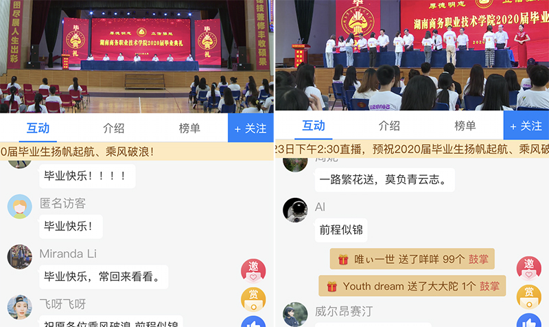 “致青春弘扬商务精神,毕业季感恩母校情深……”伴随着毕业生铿锵有力的毕业宣言,2020届毕业生的校园生活画上圆满句号。在易班直播平台上,上万名师生、家长共同观看了典礼,同学们通过评论区互道珍重、依依惜别。